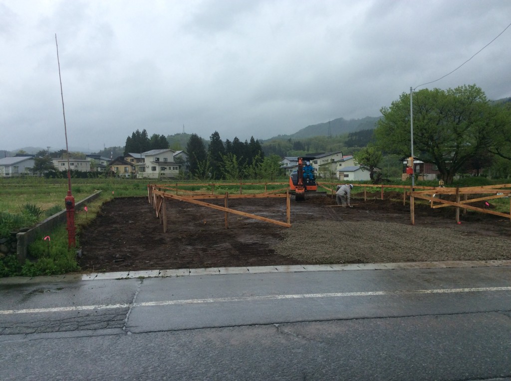 砕石を敷き詰めてバックホウ(ユンボー)で締め固めます