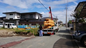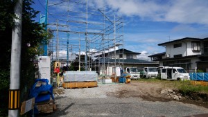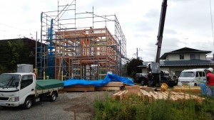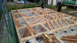 先に基礎の上端に出した「ツラ墨」に合わせながら土台を取り付け 通常の太さの倍以上もある根太を取り付けます これで床倍率は3.7倍になりますが、取付後の写真が見当たりませんでした・・・