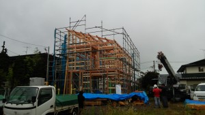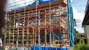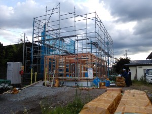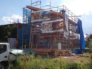屋根組が出来上がるとすぐにアルミサッシの枠を手配して取付け後 断熱材で外部を囲い始めました
