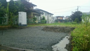 敷地の「この位置に、この向きで家を建てる」ことを示す「遣り方」(丁張)を出して砕石を入れて基礎工事が始まりました